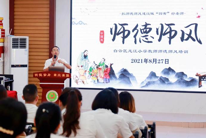 龙江小学政教主任郑亚博在会议上提到教师要以身立教,为人师表,以模范的品行来教育和影响学生。其中,“为人师表”集中反映教师的“人格魅力”,是一种极为重要的教育资源。我们提倡教师职业道德建设,强化师德师风修养,重视的是为人师者自身形象的塑造,强调的是教师以高尚的思想品德,良好的职业道德,坦荡的胸怀,高尚的言行等对学生进行“寓教于无形”的教育。教师以身示范的人格力量更容易使学生“亲其师”、“信其道”。