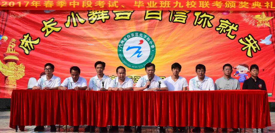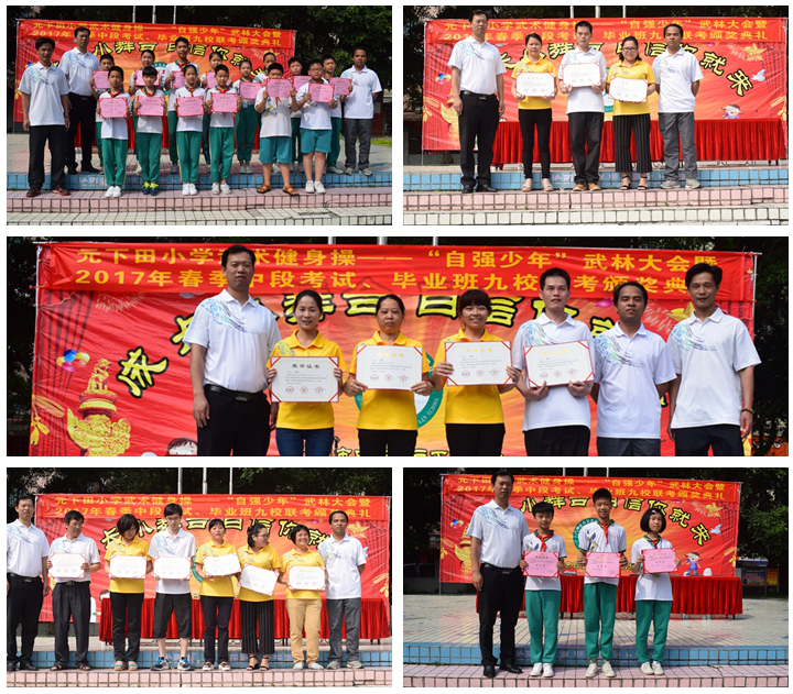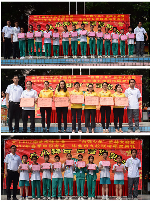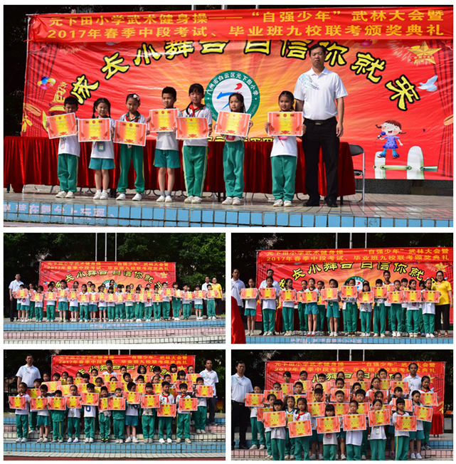 元下田小学武术健身操----“自强少年”武林大会暨2017年春季中段考试、毕业班九校联考颁奖典礼在今天隆重举行。